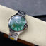 El verde profundo de la esfera captura la luz y la devuelve con elegancia parisina. Suave. Preciso. Inconfundible.