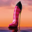 El icónico tacón de aguja está revestido con un **diseño de rayas de colores audaces**, combinando los tonos característicos de la marca: el **rojo Herrera** (pasión) y el **rosa intenso** (feminidad), con el tacón en un elegante **acabado dorado pulido**.